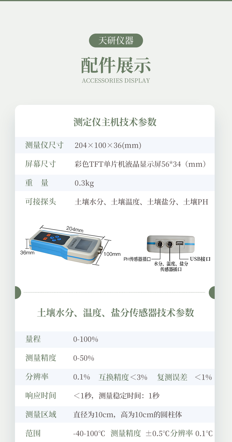 產(chǎn)品簡介: 土壤水分測定儀采用FDR頻域反射原理,快速準(zhǔn)確測量土壤中含水量,可對多處樣地、不同土壤深度的水分含量進(jìn)行快速檢測和長期連續(xù)監(jiān)測。廣泛應(yīng)用于土壤墑情檢測、旱作節(jié)水灌溉、精細(xì)農(nóng)業(yè)、林業(yè)、地質(zhì)勘探、植物培育等領(lǐng)域。 功能介紹: 儀器可加配