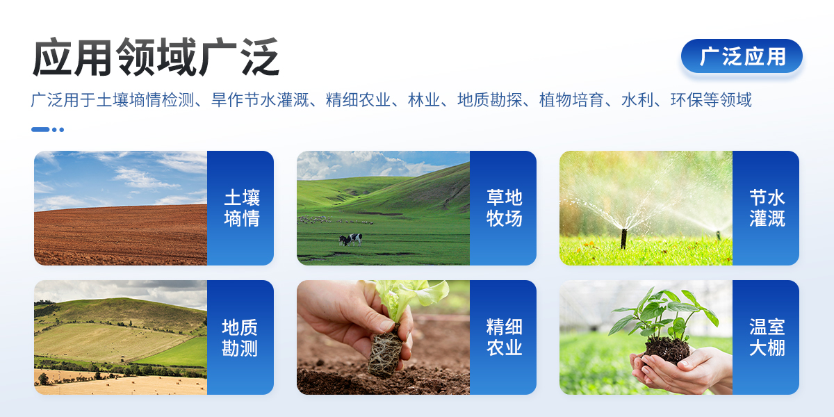 | 土壤多參數(shù)測定儀采用一體化結(jié)構(gòu)設(shè)計,可快速準確測量土壤中含水量、溫度、電導(dǎo)率(鹽分)、酸堿度、氮磷鉀,可對多處樣地、不同土壤深度的水分含量溫度鹽分和PH進行快速檢測和長期連續(xù)監(jiān)測。 廣泛應(yīng)用于土壤墑情檢測、旱作節(jié)水灌溉、精細農(nóng)業(yè)、林業(yè)、地質(zhì)勘探、植物培育、水利、環(huán)保等領(lǐng)域。 |