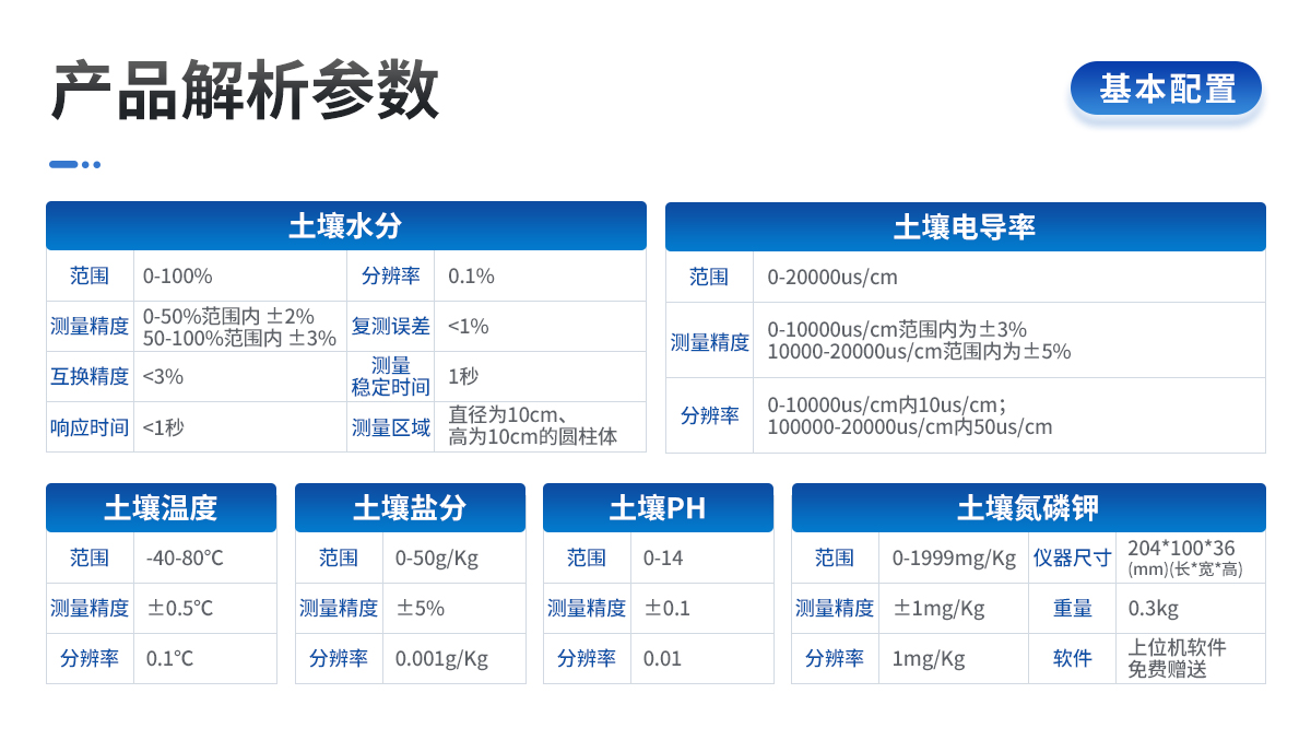 | 土壤水分:土壤容積含水量(%) 范圍:0-100% 測量精度:0-50%范圍內(nèi),±2% ;50-100%范圍內(nèi),±3% 分辨率:0.1% 互換精度:<3%> | 土壤電導(dǎo)率:范圍:0-20000us/cm 測量精度:0-10000us/cm范圍內(nèi)為±3%;10000-20000us/cm范圍內(nèi)為±5% 分辨率:0-10000us/cm內(nèi)10us/cm;100000-20000us/cm內(nèi)50us/cm | 土壤溫度:范圍:-40-80℃ 測量精度:±0.5℃ 分辨率:0.1℃ | 土壤鹽分:范圍:0-50g/Kg 測量精度:±5% 分辨率:0.001g/Kg | 土壤PH:范圍:0-14 分辨率:0.01 測量精度:±0.1 | 土壤氮磷鉀:范圍:0-1999mg/Kg 測量精度:±1mg/Kg 分辨率:1mg/Kg 儀器尺寸:204*100*36(mm)(長*寬*高) 重量:0.3kg 軟件:上位機軟件免費贈送 包裝尺寸:450*190*350mm 包裝重量:3.6kg |