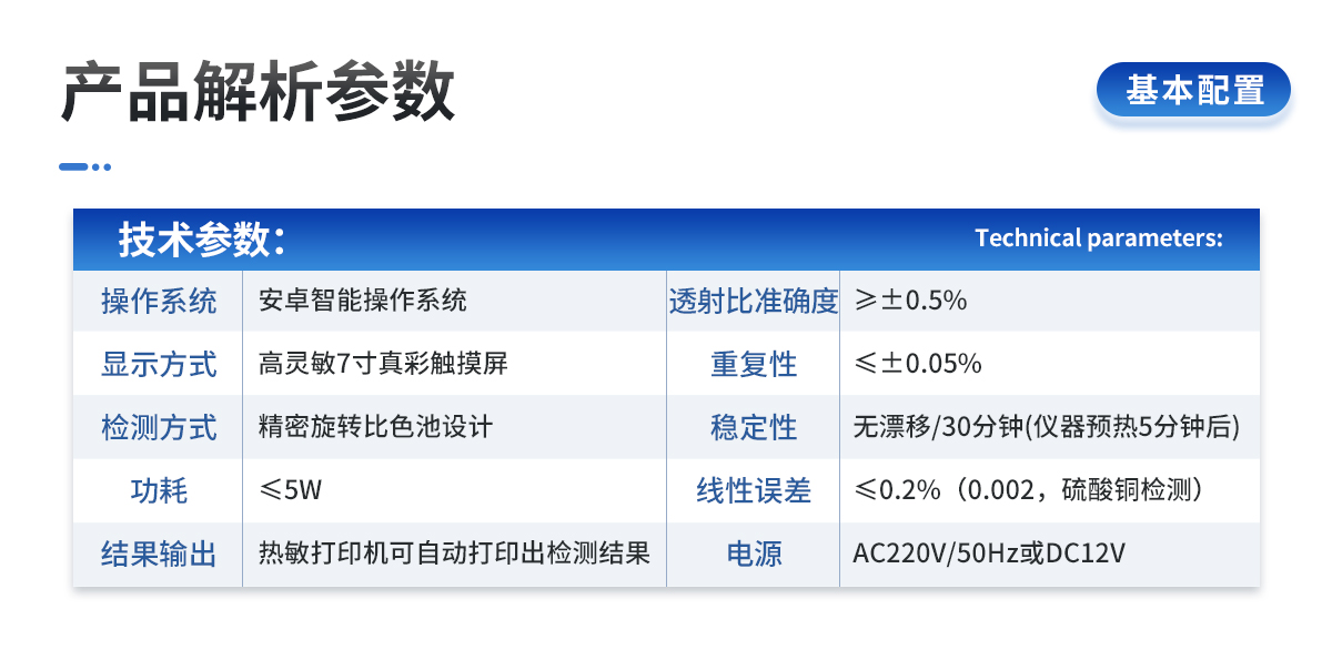 | 1、電源:交流 220±22V 直流 12V+5V(儀器內(nèi)置鋰電池也可用車載電源) | 2、功率: ≤5W | 3、量程及分辨率:0.001-9999 | 4、重復(fù)性誤差: ≤0.03%(0.0003,重鉻酸鉀溶液) | 5、儀器穩(wěn)定性:一個小時內(nèi)顯示數(shù)字無漂移(透光度測量);兩個小時內(nèi)數(shù)字漂移不超過0.3%(0.003,透光度測量)、0.001(吸光度測量)。 | 6、線性誤差: ≤0.1%(0.001,硫酸銅檢測) | 7、靈敏度:紅光≥4.5 ×10-5 藍光≥3.17×10-3 綠光≥2.35×10-3 橙光≥2.13×10-3 | 8、波長范圍 :紅光:680±2nm; 藍光:420±2nm; 綠光:510±2nm;橙光:590±4nm | 9、顯示屏分辨率:1024*600 | 10、抗震等級:IP65 | 11、儀器尺寸:48×34.5×22cm | 12、主機凈重:5.2kg | 13、包裝尺寸:510*390*375mm | 14、包裝重量:10.7kg |