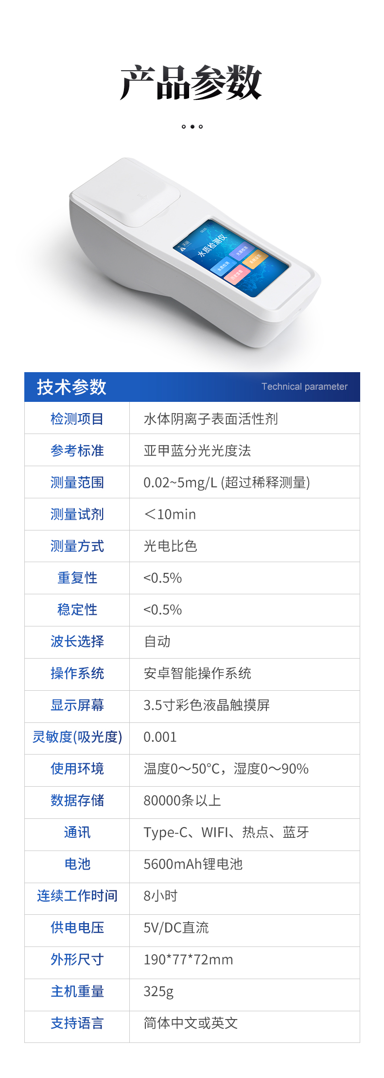 便攜式陰離子表面活性劑檢測儀參考《水質(zhì) 陰離子表面活性劑的測定 亞甲藍(lán)分光光度法》方法設(shè)計制造,本儀器采用高精度長壽命冷光源,可“快速、簡單、準(zhǔn)確、穩(wěn)定”進(jìn)行測量,儀器廣泛應(yīng)用于飲用水、地表水、生活污水水、廢水等的水質(zhì)陰離子表面活性劑含量的測定。