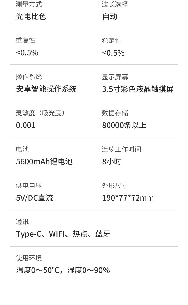 | 操作系統(tǒng):安卓智能操作系統(tǒng); | 顯示屏幕:3.5寸彩色液晶觸摸屏; | 靈敏度(吸光度):0.001; | 使用環(huán)境:溫度0~50℃,濕度0~90%; | 數(shù)據(jù)存儲:80000條以上; |