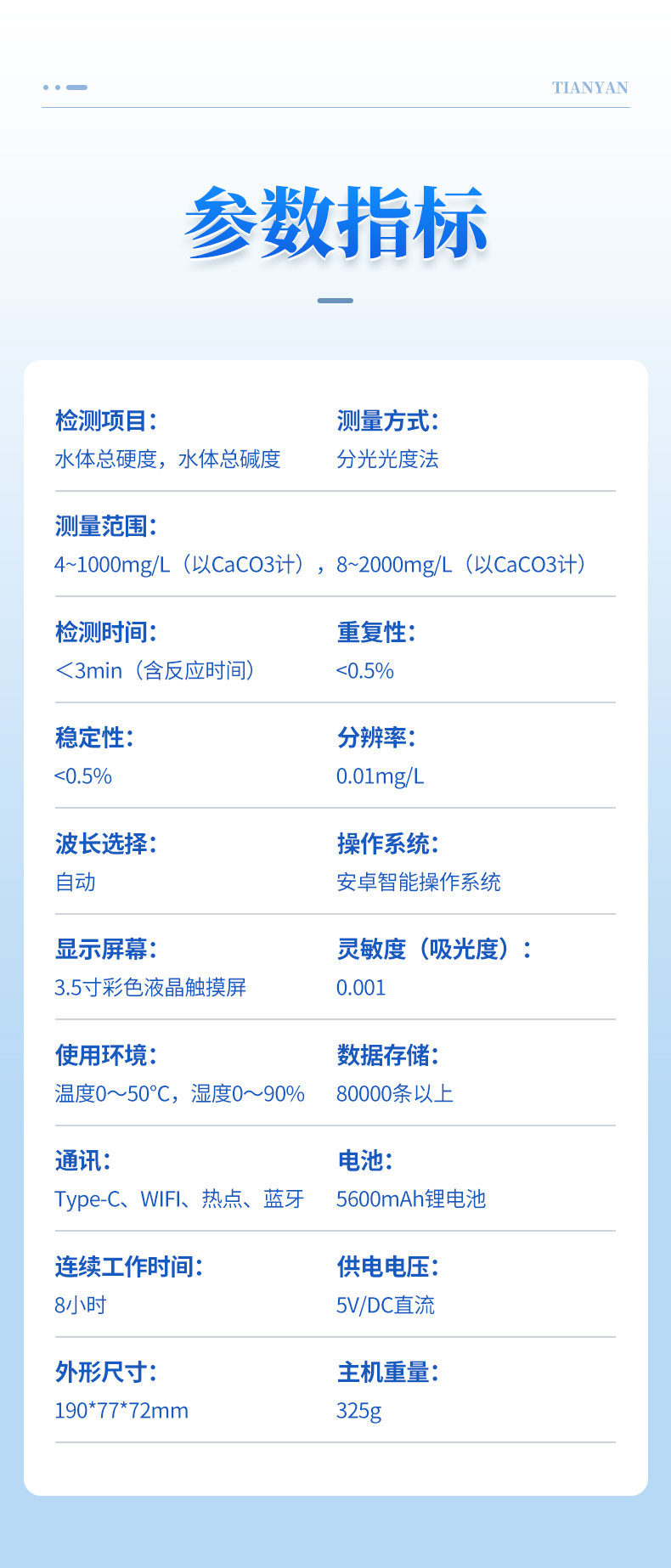 | 檢測項(xiàng)目:水體總硬度,水體總堿度; | 測量范圍:4~1000mg/L(以CaCO3計(jì)),8~2000mg/L(以CaCO3計(jì)); | 測量方式:分光光度法; | 檢測時間:<3min(含反應(yīng)時間); | 重復(fù)性:<0.5%; | 穩(wěn)定性:<0.5%; |