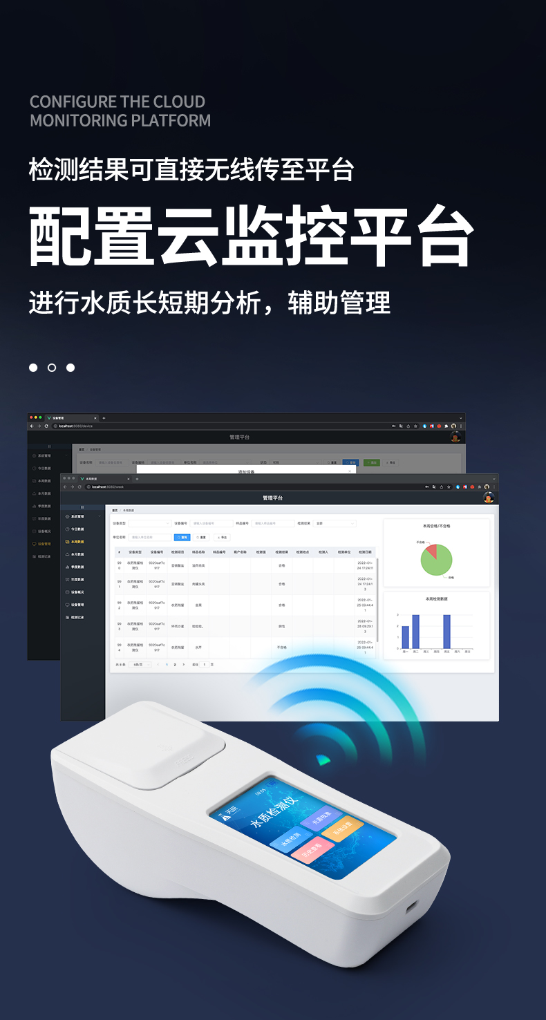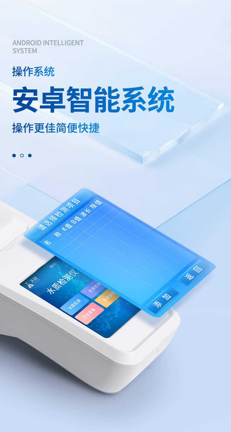 | 1、安卓智能系統(tǒng),操作更佳簡(jiǎn)便快捷; | 2、配置云監(jiān)控平臺(tái),檢測(cè)結(jié)果可直接無線傳至平臺(tái),進(jìn)行水質(zhì)長(zhǎng)短期分析,輔助管理。 | 3、內(nèi)置操作流程、操作簡(jiǎn)單、無需培訓(xùn)、直接上手; | 4、檢測(cè)速度快,現(xiàn)場(chǎng)讀取數(shù)據(jù) | 5、便攜式體積小,重量輕,方便戶外檢測(cè) | 6、外形小巧美觀,工作穩(wěn)定免維護(hù),具有較好的性價(jià)比 | 7、采用進(jìn)口冷光源,光學(xué)性能穩(wěn)定,壽命長(zhǎng)達(dá)10萬(wàn)小時(shí) | 8、交直流兩用,內(nèi)置充電鋰電池,環(huán)保耐用可支持連續(xù)室內(nèi)外工作。 |