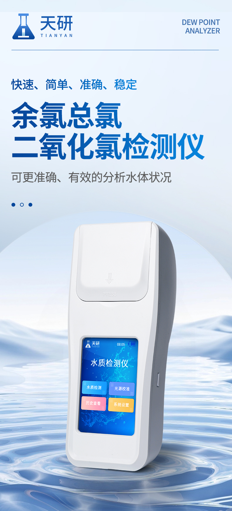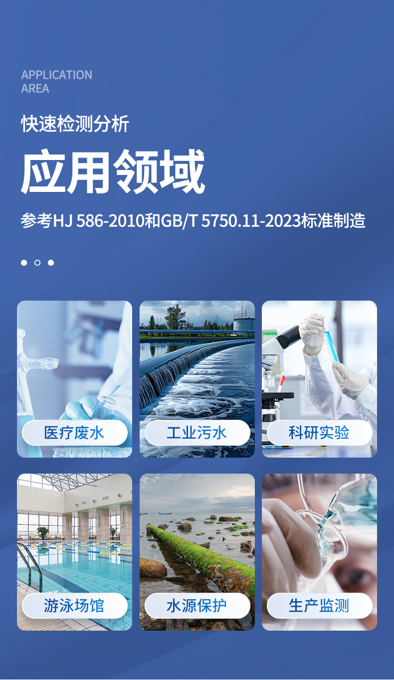 適用于 飲用水、自來水、醫(yī)療廢水、工業(yè)污、河流監(jiān)測(cè)、游泳場(chǎng)館、水源保護(hù)、生產(chǎn)監(jiān)測(cè)、科研實(shí)驗(yàn)等。