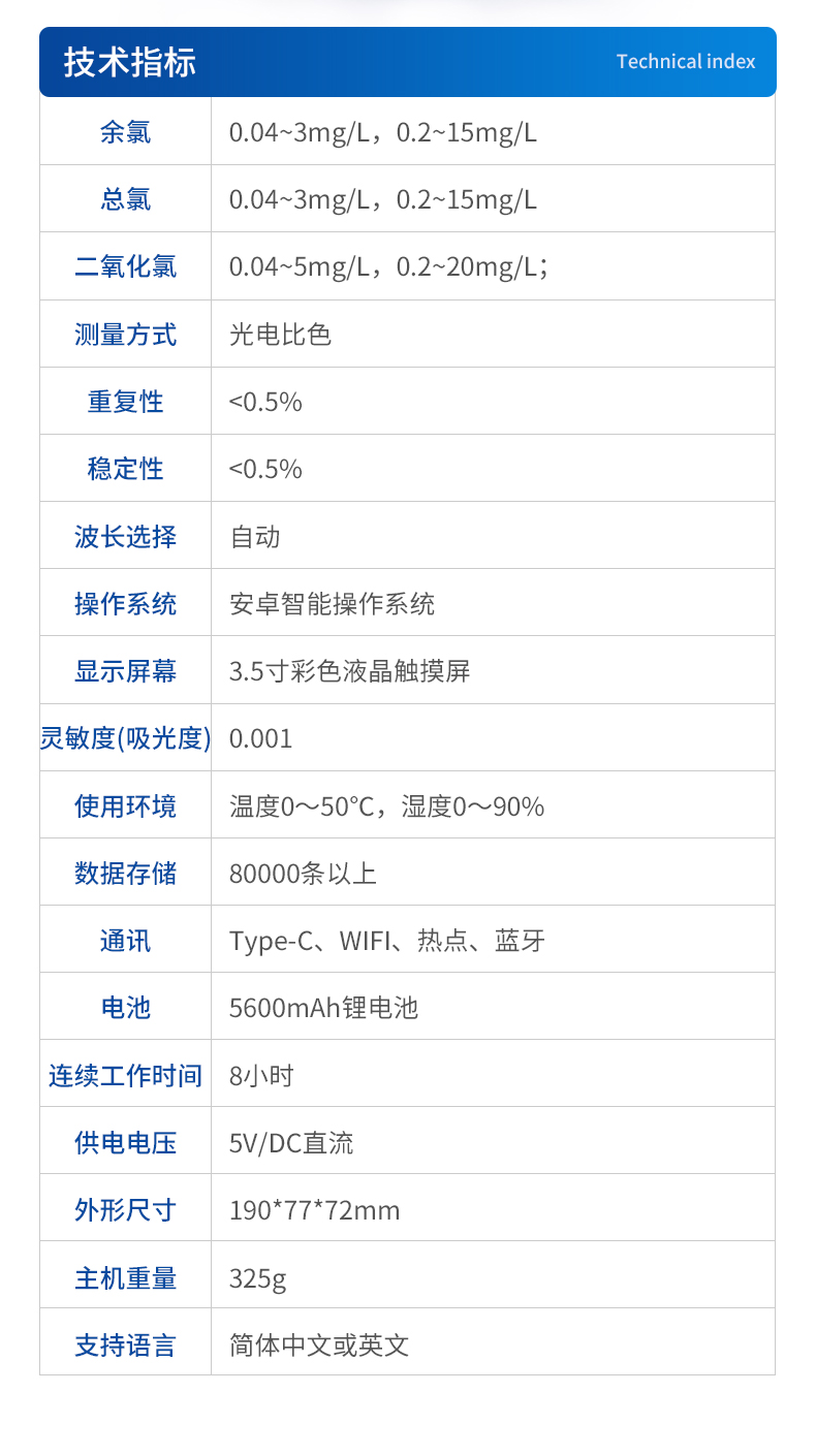 | 余氯:0.04~3mg/L,0.2~15mg/L; | 總氯:0.04~3mg/L,0.2~15mg/L; | 二氧化氯:0.04~5mg/L,0.2~20mg/L; | 測(cè)量方式:光電比色 | 重復(fù)性:<0.5%> | 穩(wěn)定性:<0.5%> | 波長(zhǎng)選擇:自動(dòng) | 操作系統(tǒng):安卓智能操作系統(tǒng) | 顯示屏幕:3.5寸彩色液晶觸摸屏 | 靈敏度(吸光度):0.001 | 使用環(huán)境:溫度0~50℃,濕度0~90% | 數(shù)據(jù)存儲(chǔ):80000條以上 | 通訊:Type-C、WIFI、熱點(diǎn)、藍(lán)牙 | 電池:5600mAh鋰電池 | 連續(xù)工作時(shí)間:8小時(shí) | 供電電壓:5V/DC直流 | 外形尺寸:190*77*72mm | 支持語(yǔ)言:簡(jiǎn)體中文或英文 | 主機(jī)重量:325g | 儀器包裝尺寸:350*150*300mm | 包裝重量:2kg |