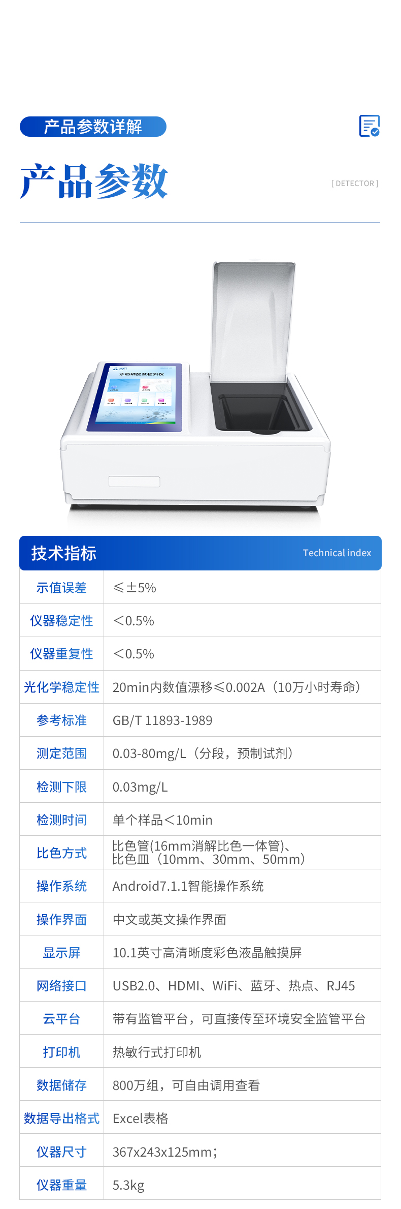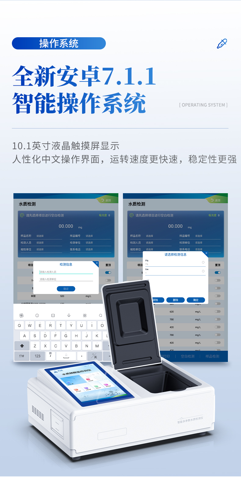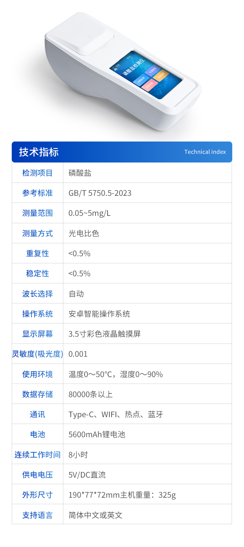 | 檢測項(xiàng)目:磷酸鹽 | 參考標(biāo)準(zhǔn):GB/T 5750.5-2023 | 測量范圍:0.05~5mg/L | 測量方式:光電比色 | 重復(fù)性:<0.5%> | 穩(wěn)定性:<0.5%> | 操作系統(tǒng):安卓智能操作系統(tǒng) | 顯示屏幕:3.5寸彩色液晶觸摸屏 | 靈敏度(吸光度):0.001 | 使用環(huán)境:溫度0~50℃,濕度0~90% | 數(shù)據(jù)存儲:80000條以上 | 通訊:Type-C、WIFI、熱點(diǎn)、藍(lán)牙 | 電池:5600mAh鋰電池 | 連續(xù)工作時間:8小時 | 供電電壓:5V/DC直流 | 外形尺寸:190*77*72mm主機(jī)重量:325g | 支持語言:簡體中文或英文 |