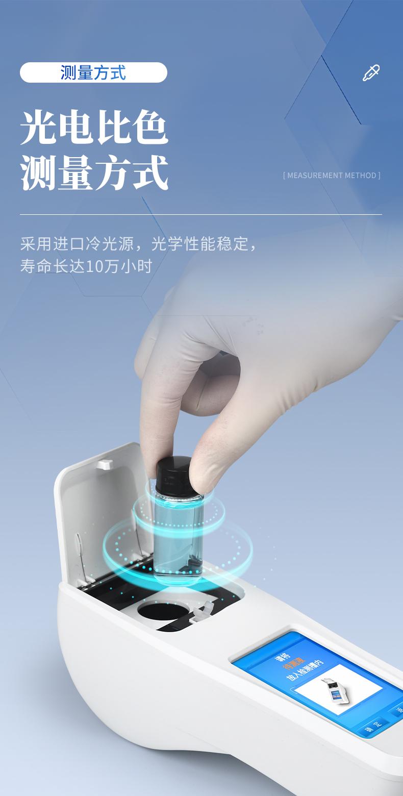 提取一定量水體樣品,經(jīng)過前處理后根據(jù)不同檢測項(xiàng)目按照試劑說明書滴入檢測試劑,檢測試劑會與水體中的待測物質(zhì)發(fā)生反應(yīng),反應(yīng)液呈現(xiàn)特定的顏色。