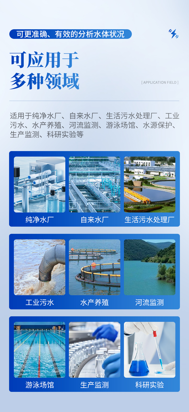適用于純凈水廠、自來水廠、生活污水處理廠、工業(yè)污水、水產(chǎn)養(yǎng)殖、河流監(jiān)測、游泳場館、水源保護(hù)、生產(chǎn)監(jiān)測、科研實(shí)驗(yàn)等。