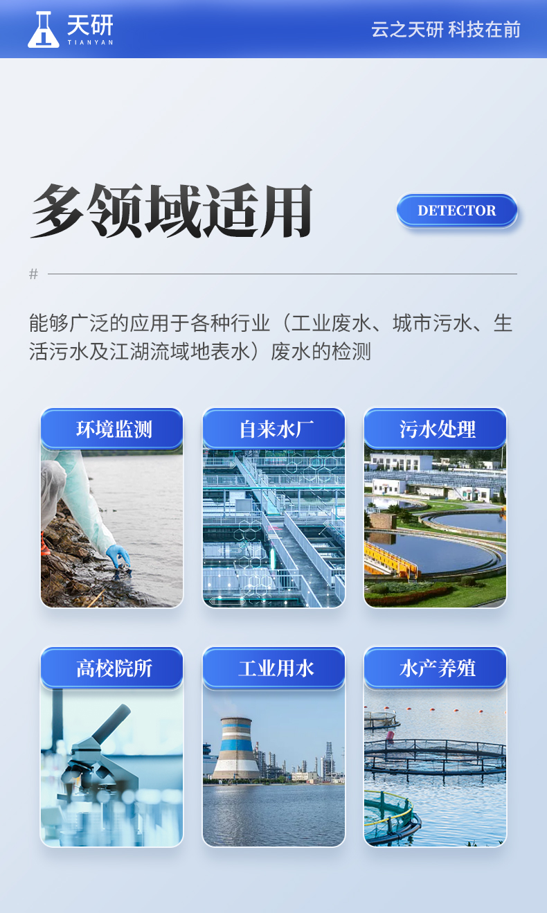 能夠廣泛的應(yīng)用于各種行業(yè)(工業(yè)廢水、城市污水、生活污水及江湖流域地表水)廢水的檢測,可適合不同用戶的多種需求,可在化工、石油、焦化、造紙、冶金、釀造、醫(yī)藥等工業(yè)廢水及各種生活污水監(jiān)測應(yīng)用。
