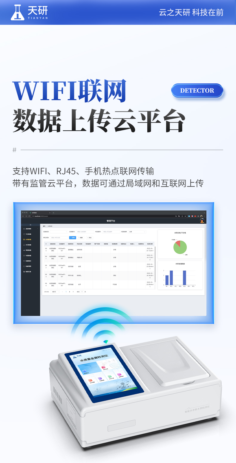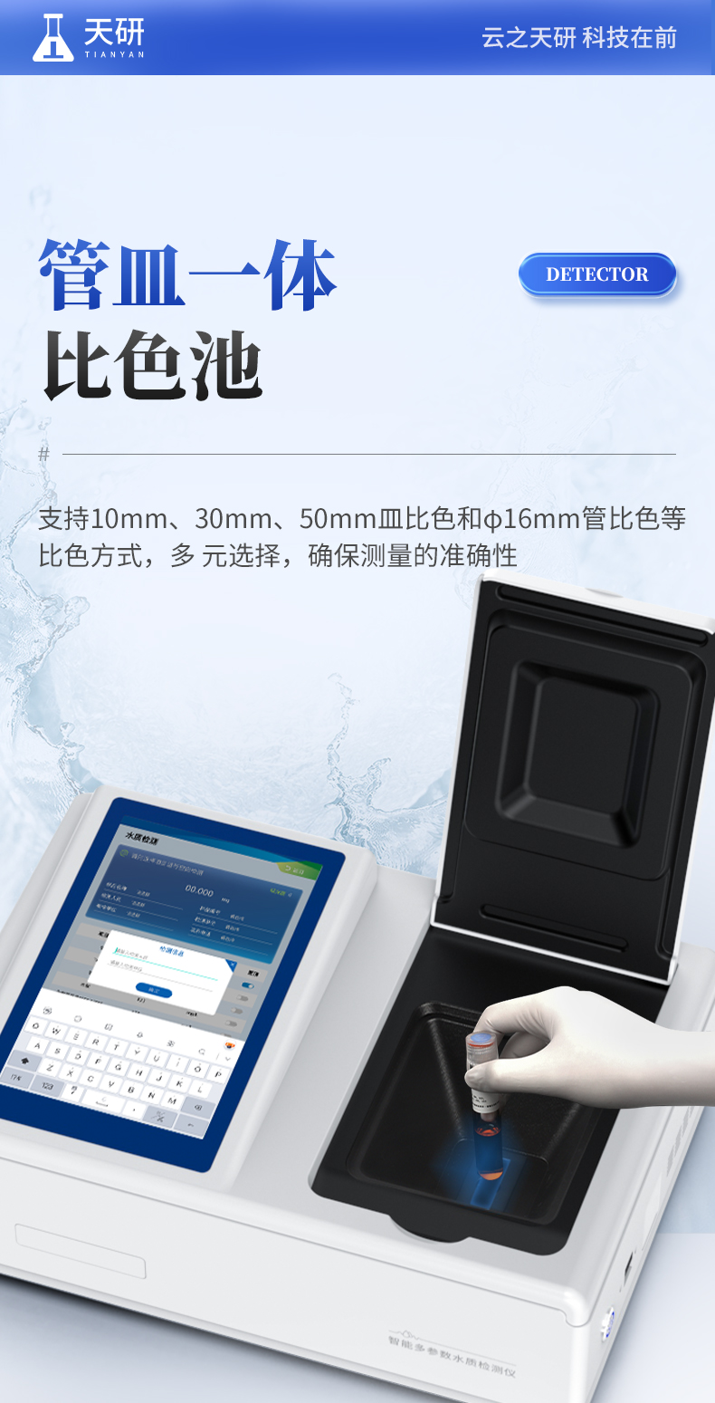 | 1、采用全新安卓7.1.1智能操作系統(tǒng),人性化中文操作界面,運轉(zhuǎn)速度更快速,穩(wěn)定性更強。 | 2、10.1英寸液晶觸摸屏顯示,人性化中文操作界面,讀數(shù)直觀、簡單。 | 3、采用精密比色池設(shè)計,使用光源一致,可以解決由于光源誤差帶來的檢測結(jié)果誤差問題,檢測結(jié)果更加精準(zhǔn)。 | 4、光源采用進(jìn)口超高亮發(fā)光二極管,光源亮度可以自動調(diào)節(jié)與校準(zhǔn)。 | 5、支持10mm、30mm、50mm皿比色和φ16mm管比色等比色方式,多元選擇,確保測量的準(zhǔn)確性; | 6、具有無線通訊功能,支持WIFI、RJ45、手機熱點聯(lián)網(wǎng)傳輸,檢測數(shù)據(jù)亦可通過U盤導(dǎo)出; | 7、多功能樣品管理,可對樣品進(jìn)行中英文命名,方便樣品記錄和數(shù)據(jù)存儲; | 8、儀器可永久存儲800萬組數(shù)據(jù),為方便大量數(shù)據(jù)查找,可通過時間檢索,并隨意選擇分析; | 9、儀器帶有監(jiān)管云平臺,數(shù)據(jù)可通過局域網(wǎng)和互聯(lián)網(wǎng)上傳,亦可對接上傳至環(huán)境監(jiān)管部門平臺。 | 10、內(nèi)置熱敏行式打印機,打印紙上的內(nèi)容可自由選擇(包括二維碼打印); | 11、交流220V,可選配6ah大容量充電鋰電池,方便戶外流動測試; | 12、后期產(chǎn)品固件可升級。 |