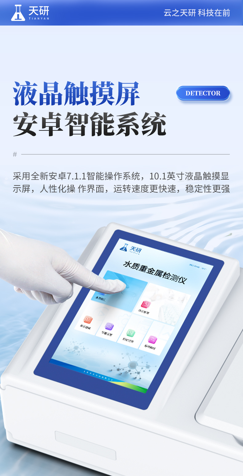 多參數(shù)水質(zhì)重金屬檢測儀是完全參考國家標(biāo)準(zhǔn)、環(huán)境標(biāo)準(zhǔn)等相關(guān)標(biāo)準(zhǔn)設(shè)計制造,適用于國內(nèi)外眾多檢測標(biāo)準(zhǔn)。 主要檢測水質(zhì)六價鉻、總鉻、鉛、鎘、汞、砷、銅、總銅、鋅、總鋅、鐵、總鐵、鎳、總鎳、錳、總錳、鈦、釩、銀、鋁、錫、鈹、鋇、銻、鈷等重金屬含量指標(biāo);本儀器兼具智能數(shù)據(jù)分析功能,圖表、列表顯示數(shù)據(jù),分析一目了然;高清晰度彩色液晶觸摸顯示屏,Android智能操作系統(tǒng),中文顯示界面,中英文鍵盤,人性化操作,使用更簡單。