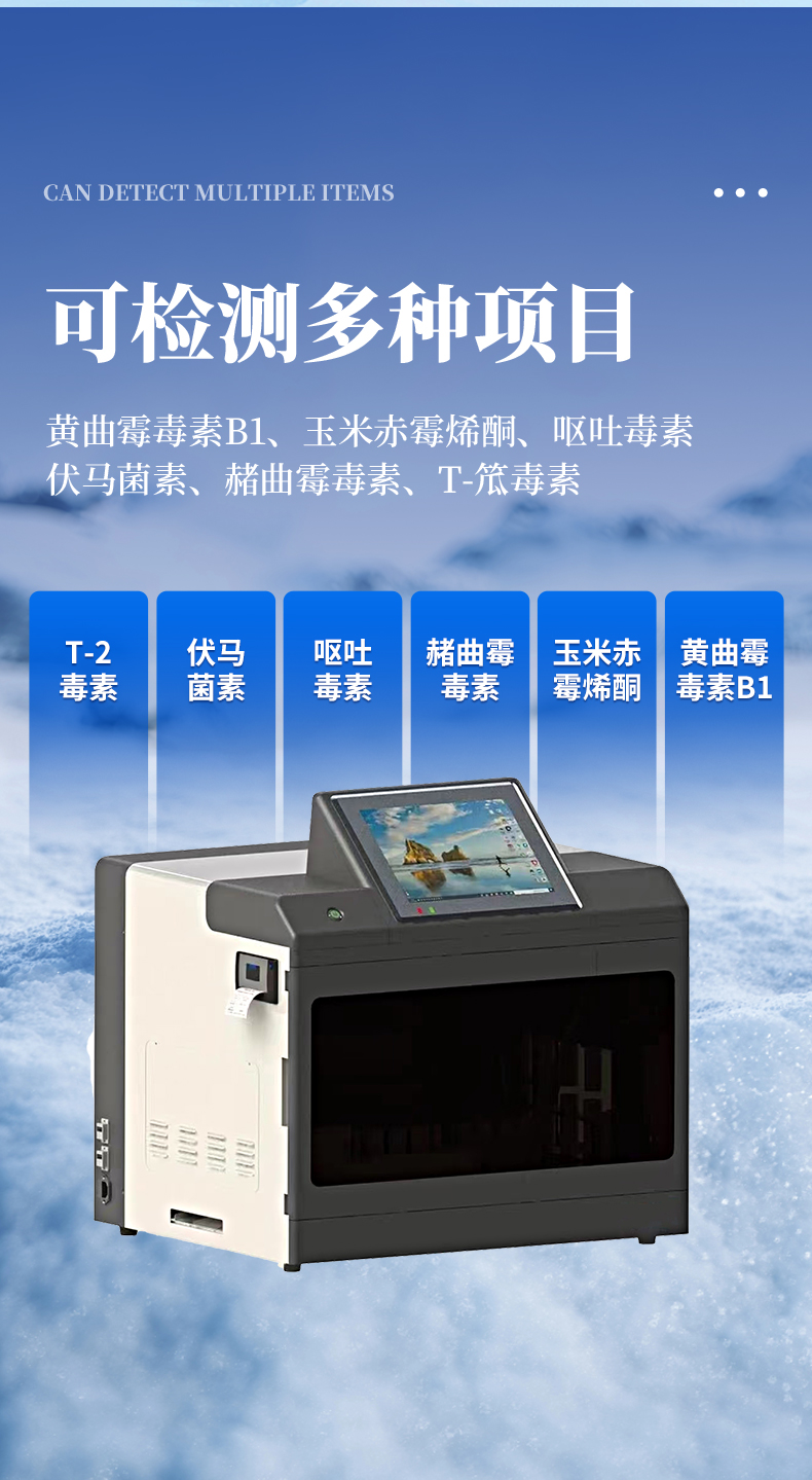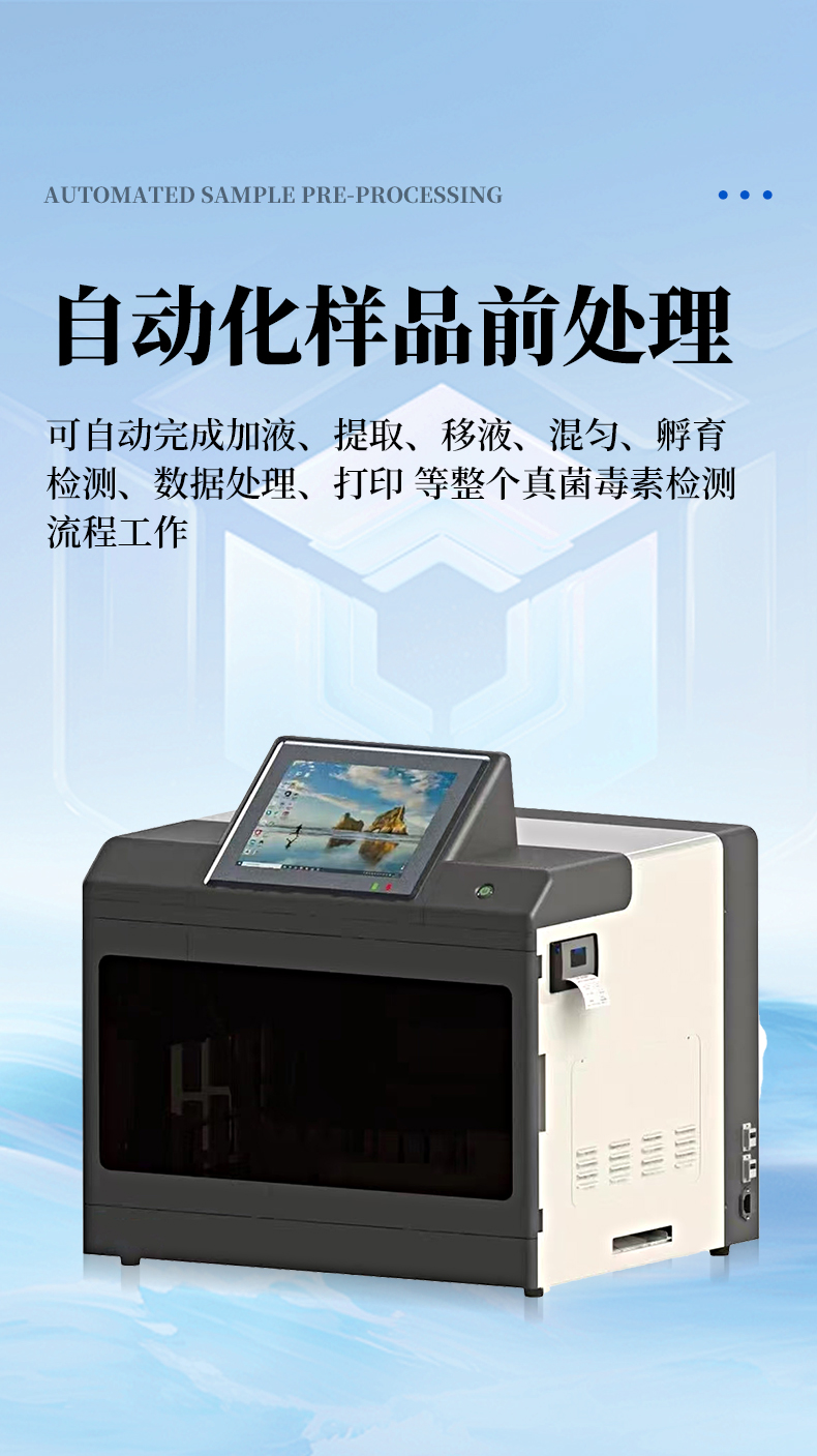 全自動真菌毒素檢測儀簡述: 本產(chǎn)品是以真菌毒素分析前處理技術開發(fā)的全自動檢測儀,可自動完成提取、混勻、移液、孵育、檢測、數(shù)據(jù)處理、打印等全流程工作。該儀器基于光電檢測原理的免疫熒光檢測技術,配套專用熒光免疫試劑,通過自動化樣品前處理替代人工操作,可檢測黃曲霉B1、嘔吐毒素等多種