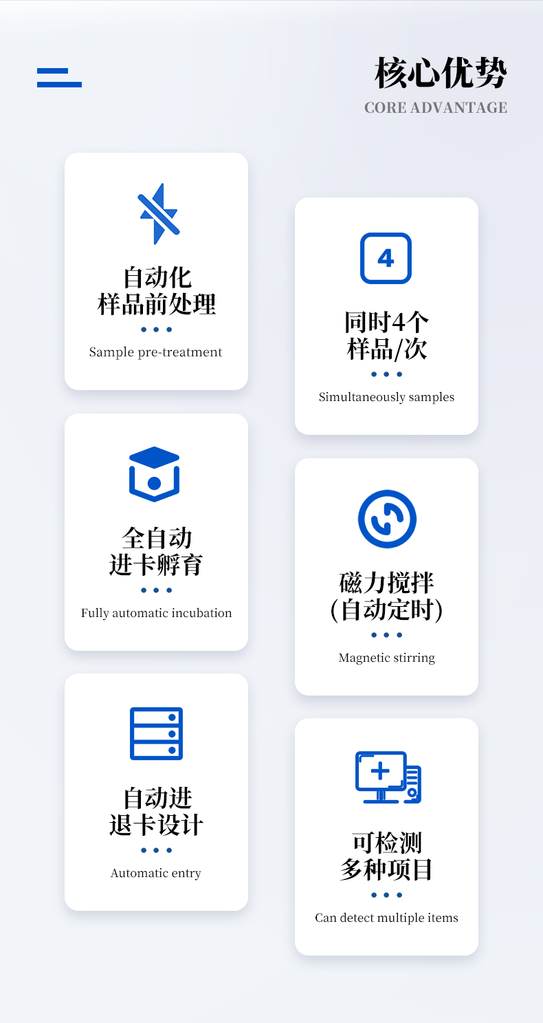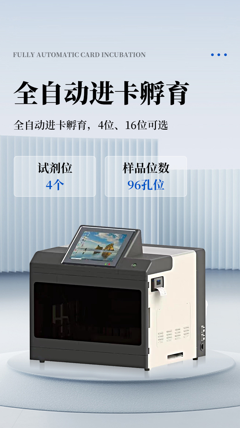 | 5、樣品位數(shù):96孔位; | 6、試劑位:4個; | 7、孵育位:全自動進卡孵育,4位、16位可選; | 8、溫度設定范圍:20-50℃范圍可調(diào); |