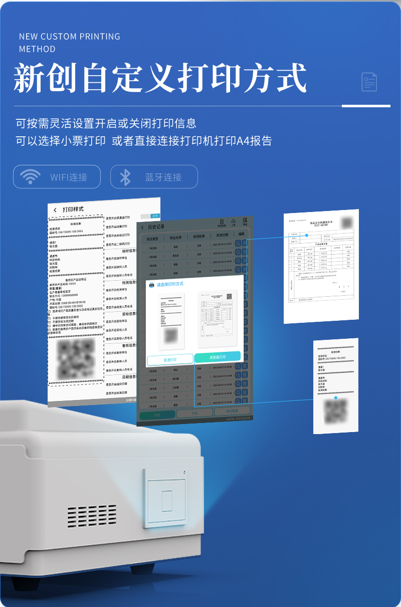 | 儀器采用手提式一體化系統(tǒng)檢測(cè)技術(shù),將分光光度模塊、新型農(nóng)殘檢測(cè)模塊、數(shù)字化管理模塊、無(wú)線通訊模塊高度集成于一體,支持檢測(cè)200種食品安全檢測(cè)項(xiàng)目,同時(shí)預(yù)留升級(jí)檢測(cè)方法。 | 儀器檢測(cè)模塊標(biāo)準(zhǔn)化、智能化,檢測(cè)項(xiàng)目可隨意自由組合。檢測(cè)箱體內(nèi)置多個(gè)標(biāo)準(zhǔn)檢測(cè)單元,檢測(cè)模塊可以調(diào)整配置。 | 顯示屏幕:儀器采用10.1英寸豎向液晶觸摸屏顯,搭配運(yùn)行安卓智能操作系統(tǒng),主控芯片采用ARM Cortex-A7,RK3288/4核處理器,主頻1.88Ghz,操作方便,性能更強(qiáng)。 | 檢測(cè)通道:≥12通道;采用精密旋轉(zhuǎn)比色池設(shè)計(jì),使用同芯片同光源校準(zhǔn)精度,解決不同光源之間的誤差值,更加準(zhǔn)確**。(1-12通道間誤差0.1%,**號(hào):ZL202022821055.2) | 儀器光源:高精度進(jìn)口四波長(zhǎng)冷光源,每個(gè)通道均配置 410、520、590、630nm 波長(zhǎng)光源,標(biāo)配**的光路切換裝置,**光路切換功能可實(shí)現(xiàn)64波長(zhǎng),并且所有檢測(cè)項(xiàng)目可實(shí)現(xiàn)所有通道同時(shí)檢測(cè)。 | 設(shè)備可一鍵校準(zhǔn),自動(dòng)保存校準(zhǔn)數(shù)據(jù),自動(dòng)對(duì)比校驗(yàn),得到精準(zhǔn)光源,采用Android SP存儲(chǔ)數(shù)據(jù),光源數(shù)據(jù)永不丟失,方便每一次使用。 | 通訊接口:配備無(wú)線通信模塊、4G(APN)通訊模塊、藍(lán)牙傳輸,同時(shí)具有雙USB接口以及RJ45網(wǎng)線接口,可以多方式實(shí)現(xiàn)數(shù)據(jù)保存及數(shù)據(jù)傳輸 | 存儲(chǔ)方式:支持U盤(pán)存儲(chǔ),標(biāo)準(zhǔn)USB接口,免驅(qū)動(dòng)安裝。檢測(cè)結(jié)果存儲(chǔ)容量20萬(wàn)條以上,可生成Excel表格進(jìn)行拷貝,并具有登錄保護(hù)功能。 | 智能化操作系統(tǒng): | 1)操作系統(tǒng):儀器可在同一檢測(cè)界面自動(dòng)對(duì)應(yīng)相關(guān)檢測(cè)通道,一次性選擇1-12個(gè)樣品名稱,無(wú)需退出界面,節(jié)省操作時(shí)間。并可以對(duì)每個(gè)通道屬性和樣品信息單獨(dú)進(jìn)行編輯,例如送檢單位、人員,檢測(cè)人員等,打印時(shí)勾選打印顯示。 | 2)數(shù)據(jù)集成系統(tǒng):設(shè)備首頁(yè)自動(dòng)匯總分析檢測(cè)數(shù)據(jù),包含:周檢測(cè)數(shù)據(jù)、月檢測(cè)數(shù)據(jù),全部檢測(cè)總數(shù)量,均包含檢測(cè)總數(shù),合格數(shù),不合格數(shù),以及相關(guān)柱形分析圖,各項(xiàng)檢測(cè)數(shù)據(jù)一目了然,無(wú)需電腦查詢,更加快捷直觀。 | 3)數(shù)據(jù)庫(kù)系統(tǒng):十幾項(xiàng)數(shù)據(jù)庫(kù)分類(lèi)管理儀器:包含項(xiàng)目類(lèi)型、項(xiàng)目數(shù)據(jù)、檢測(cè)數(shù)據(jù)、歷史記錄、國(guó)標(biāo)信息、曲線信息、采樣信息、檢測(cè)信息、受檢信息、復(fù)核信息、圖表信息、光源校準(zhǔn)信息、打印樣式信息、樣品庫(kù)信息等等,數(shù)據(jù)庫(kù)之間互相協(xié)調(diào)聯(lián)動(dòng)保證數(shù)據(jù)的真實(shí)完整性。同時(shí)產(chǎn)品數(shù)據(jù)庫(kù)以及歷史檢測(cè)記錄支持一鍵檢索功能。 | 4)限量規(guī)判系統(tǒng):具有限量查詢、添加物質(zhì)合規(guī)判定系統(tǒng)。檢測(cè)出結(jié)果后,系統(tǒng)自動(dòng)調(diào)用系統(tǒng)數(shù)據(jù)庫(kù)中相關(guān)國(guó)標(biāo)進(jìn)行比對(duì)判定,客觀顯示判定結(jié)果是否合格。 | 5)項(xiàng)目預(yù)設(shè)系統(tǒng):儀器具有任務(wù)預(yù)設(shè)模塊,一鍵提前預(yù)設(shè),給出方便快捷的新檢測(cè)方案,每一個(gè)任務(wù)分別可以設(shè)置不同的樣品、批次、編號(hào)、來(lái)源、備注、抽樣信息、檢測(cè)信息、受檢信息、復(fù)核信息等更多信息。樣品送檢時(shí)一鍵調(diào)取保存信息,并可多次調(diào)取,大大提高檢測(cè)效率。 | 6)數(shù)據(jù)監(jiān)管系統(tǒng):同步對(duì)接監(jiān)管平臺(tái),數(shù)據(jù)可局域網(wǎng)和互聯(lián)網(wǎng)數(shù)據(jù)上傳,檢測(cè)結(jié)果可選擇直接傳至食品安全監(jiān)管平臺(tái)。進(jìn)行區(qū)域食品安全監(jiān)管及大數(shù)據(jù)分析處理與數(shù)據(jù)統(tǒng)計(jì),檢測(cè)區(qū)域食品安全長(zhǎng)短期動(dòng)態(tài),達(dá)到食品安全問(wèn)題預(yù)估、預(yù)警。 | 7)打印系統(tǒng):內(nèi)置全新打印機(jī),新創(chuàng)自定義打印方式,可按需靈活勾選控制:產(chǎn)品合格證(國(guó)家農(nóng)業(yè)部標(biāo)準(zhǔn)要求),二維碼,抽樣信息、檢測(cè)信息,受檢信息、復(fù)核信息、抽樣日期、檢測(cè)日期等信息的打印。 | 供電模式:儀器交直流兩用,直流12V供電,可連接車(chē)載電源,可配6ah大容量充電鋰電池,電量可實(shí)時(shí)顯示,方便戶外流動(dòng)測(cè)試。 | 膠體金檢測(cè)模塊:采用雙通道CMOS成像處理技術(shù)及膠體金免疫層析技術(shù),可同時(shí)讀取雙膠體金卡數(shù)據(jù),自動(dòng)采集、處理分析,將檢測(cè)結(jié)果顯示,并可根據(jù)參考限值自動(dòng)判斷檢測(cè)結(jié)果,可檢測(cè)常見(jiàn)的獸藥殘留、生物毒素、抗生素、違禁添加物等。 | 1)探測(cè)技術(shù):CMOS成像探測(cè); | 2)檢測(cè)通道:1個(gè)通道; | 3)檢測(cè)方式:消線法和比色法; | 4)顯示模式: